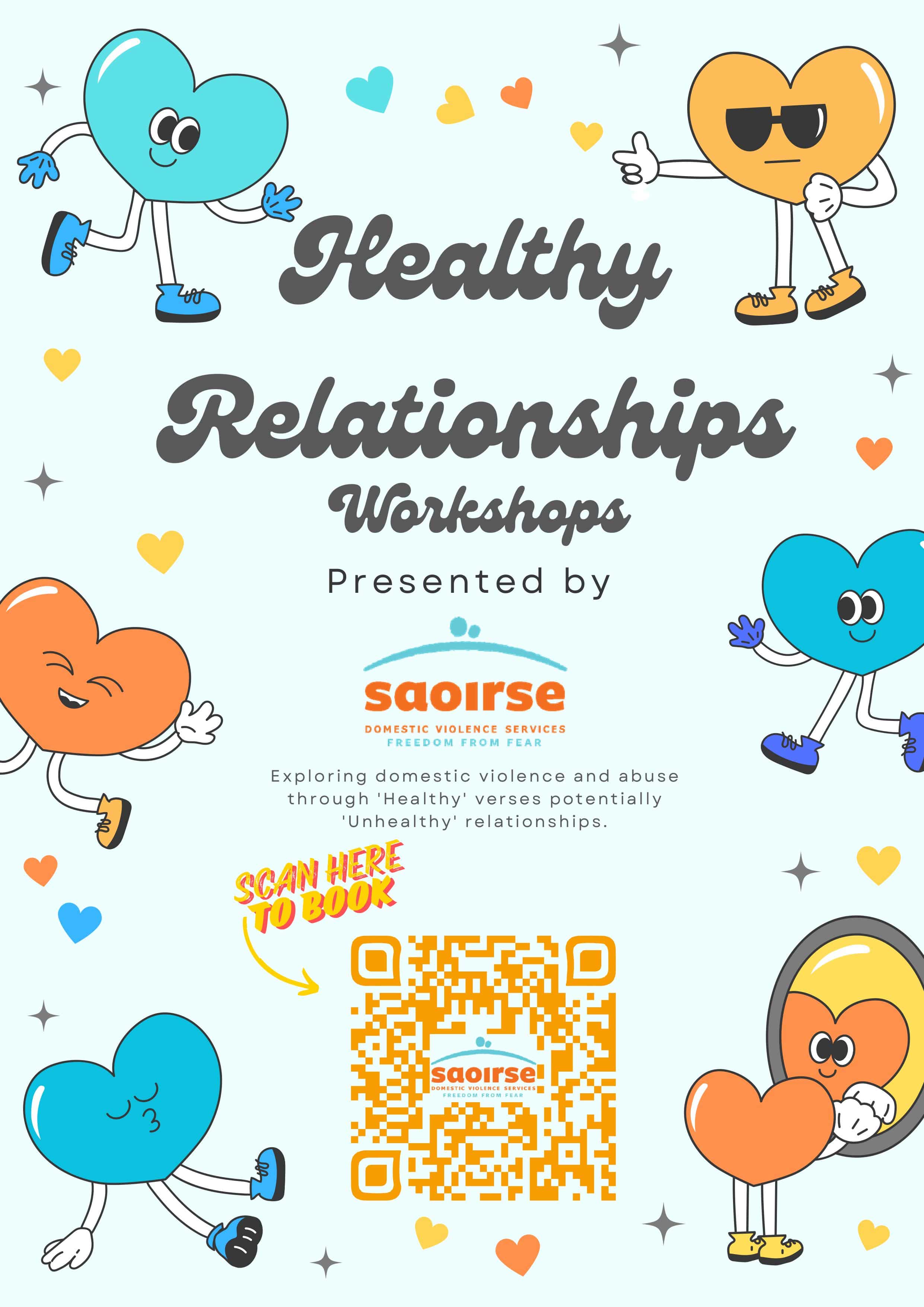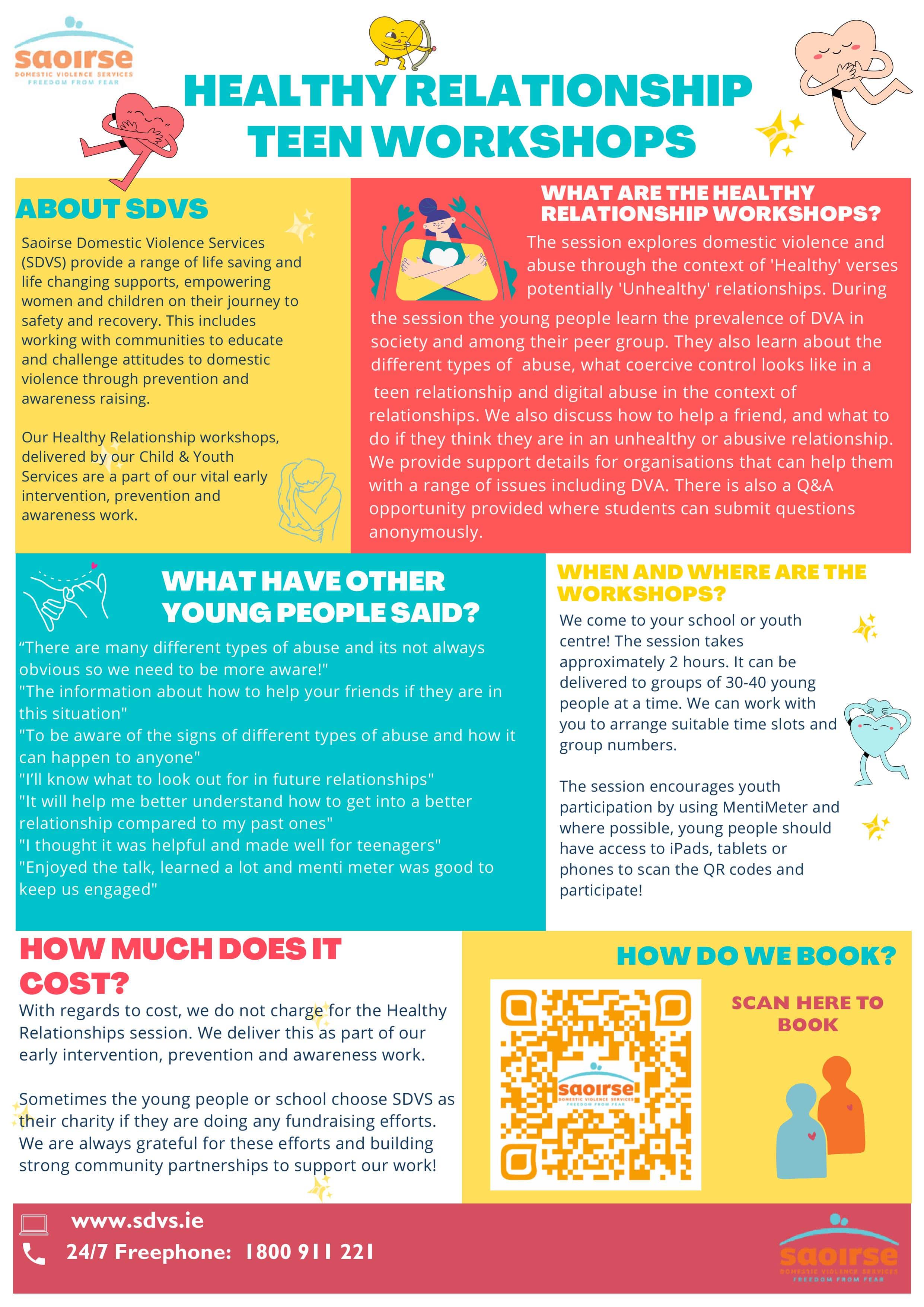The workshop sessions are designed for young people aged 13+ and explore domestic violence and abuse through the context of ‘Healthy’ versus potentially ‘Unhealthy’ relationships. During the session the young people learn the prevalence of DVA in society and among their peer group. They also learn about the different types of abuse, what coercive control looks like in a teen relationship and digital abuse in the context of relationships.